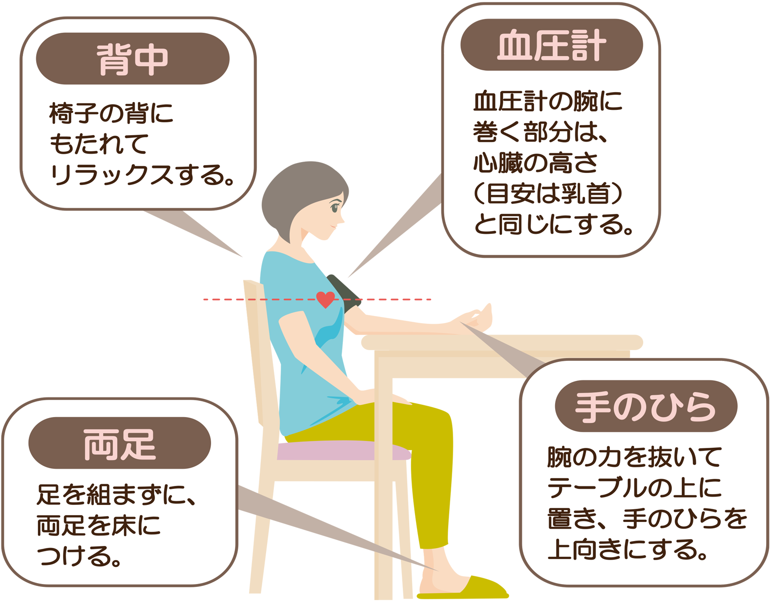- 起床後1時間以内に測定します。エアコンなどで快適な室温に調節します。尿を我慢していると血圧が高くなるので、排尿を済ませておきます。また、食事をすると血圧は下がるので、朝食前に測定しましょう。