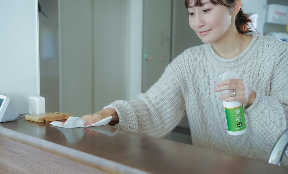 その道のプロ、例えばレストランやホテルなどで長く使われてい るものは安心して使えると思っています。特に除菌に対しては、 洗剤とは違って効果が目に見えないので、プロが使っていると信 頼できるなと感じています。あと、我が家は子どもとペットがい るので、消臭と除菌ができるものを基準に選んでいますね。 「P's GUARD 除菌スプレー」もそのうちの一つです。